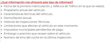 - Informe completo: Incluye toda la información administrativa, identificación del titular, municipio donde está domiciliado el vehículo, historial de ITV, kilometraje, número de titulares, cargas… así como datos técnicos, puntuación EuroNCAP y mantenimiento respecto al vehículo solicitado. Ayuda