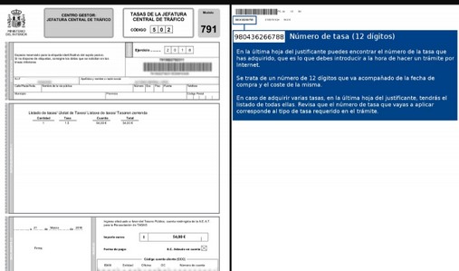 En la Segunda hoja del documento de pago de la tasa, existe un codigo de barras, con un numero debajo que empieza por 9 normalmente, ese número se debe copiar para pornerlo en la solicitud del documento o informe (señal de que se han pagado las tasas)